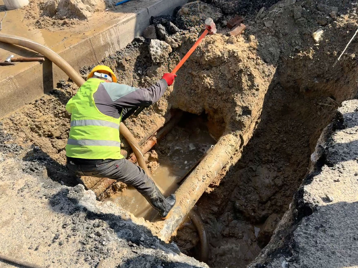 “先從這里開挖!”現(xiàn)場指揮一聲令下,打樁機轟鳴作響,人工開挖同步進行。第一個作業(yè)坑(2×3×2米)在井蓋旁逐漸成型。抽水泵開足馬力,坑內積水被不斷排出。然而,當水位下降后,搶修人員卻發(fā)現(xiàn)漏損管道不在這里。憑借多年的經(jīng)驗和細致觀察,搶修人員根據(jù)水流方向判斷,漏損管道應在后方6米處。沒有猶豫,沒有抱怨,第二個更大的作業(yè)坑(5×4×2.3米)開始挖掘。