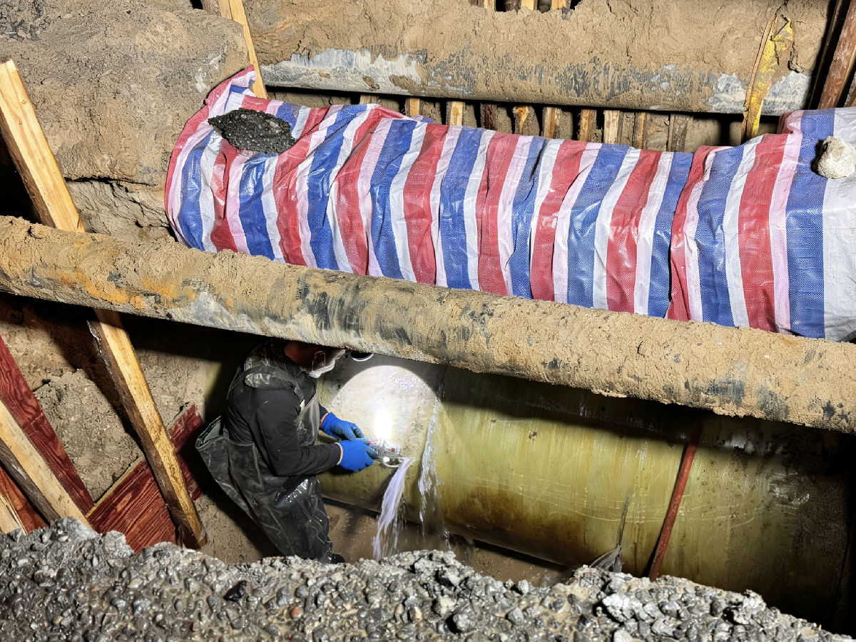 下午時分,漏點終于現(xiàn)身。在三米深的坑底,一根DN1000玻璃鋼管的側方和下方,出現(xiàn)了兩處破損。