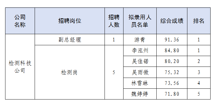 根據(jù)福建水投集團檢測科技有限公司2025年第二批招聘公告,經(jīng)過報名、資格審查、筆試、面試等公開招聘程序,現(xiàn)將6位擬錄用人員進行公示。公示時間從2025年9月12日開始,公示期為五個工作日。在此期間內(nèi),如有意見可通過來電、來信、來訪的形式反映情況。